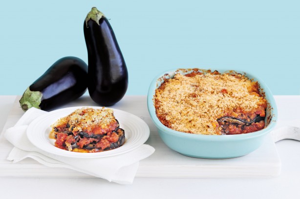 Presarati vinetele cu 2 linguri de sare si lasati-le deoparte sa iasa sucul amar. Intre timp, incalziti cuptorul la 180 ° C. Incingeti o lingura de ulei intr-o cratita si caliti ceapa pana se inmoaie. Adaugati rosiile tocate, sarea, putin piper si fierbeti, acoperite, 10 – 15 minute. Luati cratita de pe foc si adaugati busuiocul. Clatiti feliile de vinete si scurgeti-le bine.. Uscati-le cu un servet de hartie si apoi presarati-le cu faina. Incingeti jumatate din restul de ulei intr-o tigaie si rumeniti usor vinetele, pe rand, 2, 3 minute. Aranjati o treime din vinete pe fundul unui vas termorezistent, , uns cu uleim apoi presarati cu o treime din parmezan. Asezati deasupra o treime din mozzarella, asezand feliile la distante egale, apoi turnati deasupra o treime din sosul de rosii. Repetati operati de doua ori. Coaceti in centrul cuptorului, 30 minute, pana cand se rumensc usor. Presarati busuiocul taiat subtire si serviti cu paine prajita sau altfel de paine si cu salata.