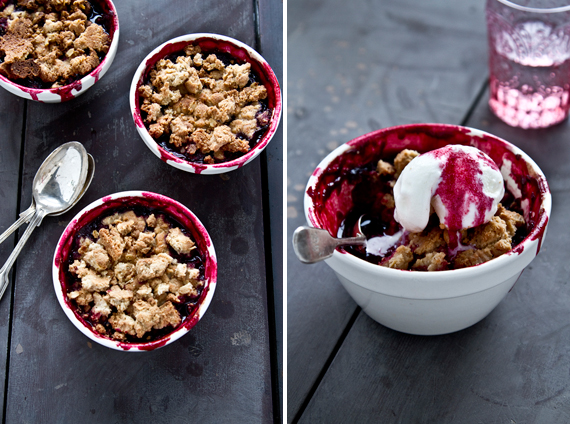 Repartizati fructele in forme de ramekin si deasupra puneti aluatul sfaramicios, cu mana. Dati la cuptorul incalzit la 180 °C pentru 20, 30 de minute.