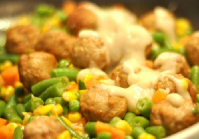 Tocati carnea de vita cu ajutorul mini tocatorului Kitchen de la Russell Hobbs. Apoi amestecati carnea tocata cu hreanul dat prin razatoarea mica, usturoiul tocat marunt, cimbrul, nucsoara, 1 ceapa toacata marunt. Potriviti de sare si piper si omogenizati bine amestecul obtinut. Cu palmele umezite formati chiftelele, treceti-le prin faina si prajiti-le in uleiul incins pana se rumenesc bine pe ambele parti. Scoateti-le pe un servetel absorbant si lasati-le sa se scurga de ulei. Puneti intr-o tigaie 3 linguri de ulei si caliti ceapa ramasa, tocata marunt. Dupa 3 minute adaugati mazarea, porumbul si zeama de lamaie si potriviti de sare si piper dupa gust. Acoperiti tigaia cu un capac si lasati sa se caleasca inabusit 10 minute, la foc mic. Puneti apoi in tigaie chiftelele prajite, acoperiti tigaia si mai lasati 10 minute, tot la foc mic. Serviti chiftelele cu porumbul, mazarea si sosul din tigaie.