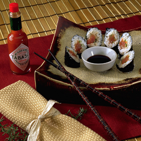 Puneti orezul la fiert intr-o oala mare timp de 2 minute. In momentul in care apa incepe sa fiarba reduceti flacara la minim si acoperiti cu un capac. Orezul este gata in momentul in care se absoarbe toata apa. Acoperiti timp de 10 minute dupa care scoateti orezul intr-un vas mare. Amestecati intr-un bol sarea, zaharul si otetul de orez pana se dizolva bine, dupa care amestecati cu orezul. Apoi, amestecati TABASCO® brand pepper sauce cu tofu, sosul de soia si cu ardeiul iute. In acest amestec se inveleste tonul.