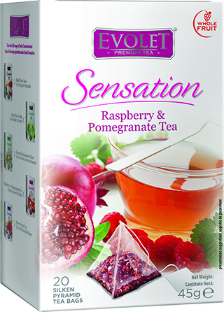 Ceai de zmeura si rodie EVOLET – flori de hibiscus care ofera o culoare atragatoare, mere,aronia, zmeura – un parfum inconfundabil al verilor, coaja de rodie – un strop de exotism, aroma de zmeura si aroma de rodie.
